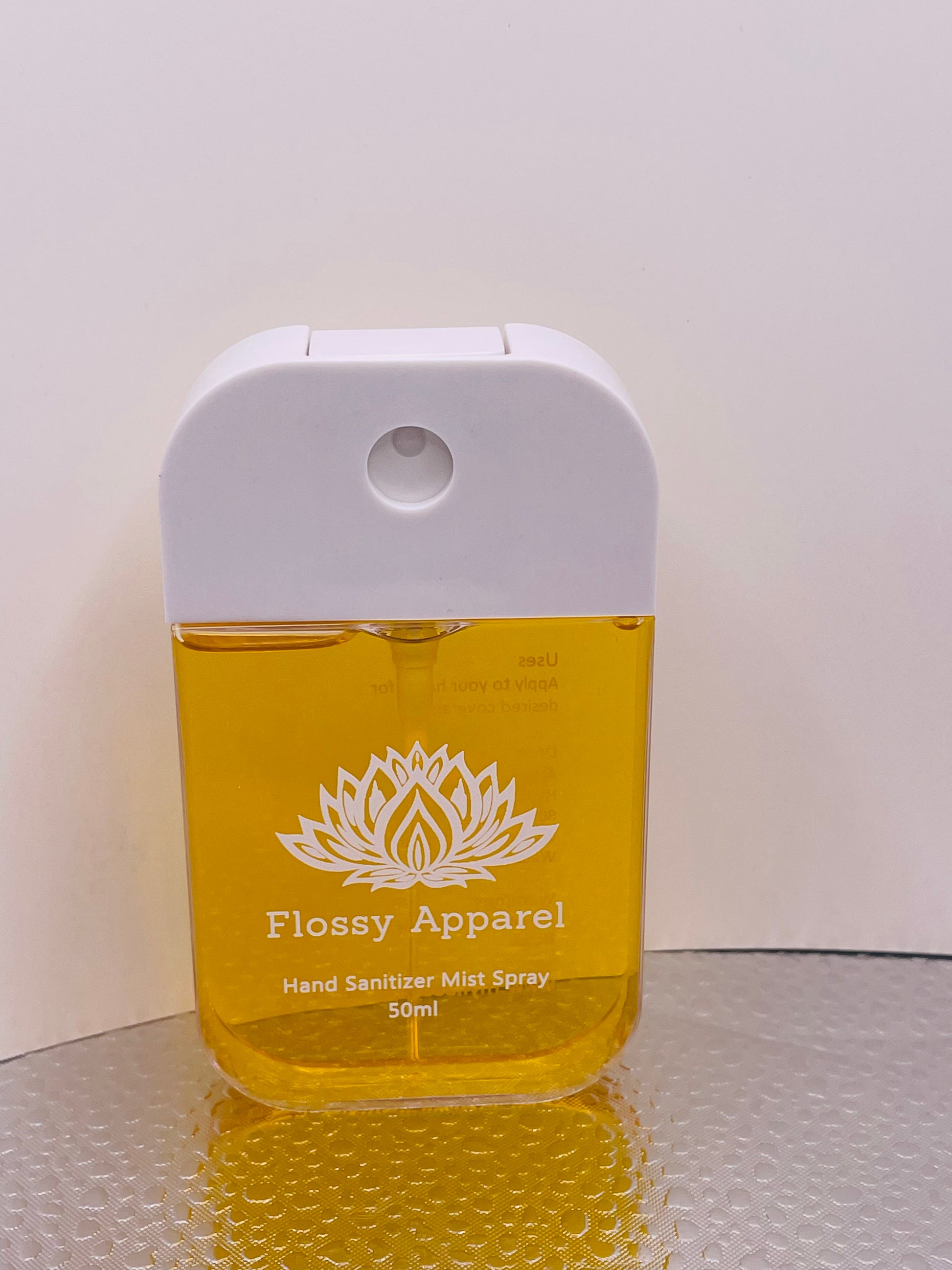Flossy Apparel Refillable Hand Sanitizer base is made with FDA/WHO formulation of 80% Alcohol, Hydrogen Peroxide (H2020) and Glycerin. Our naturally scented formulation gives the aromatic feel of refreshing comfort. Our refillable sanitizer sprayer holds up to 50 ml of scented sanitizer AND is refillable. It’s important to Flossy that we do our part in protecting the environment by not having our bottles end up in the landfill; reuse and recycle. Join us in enjoying our product which is:Â